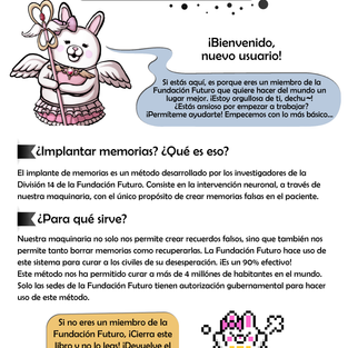 - Manual para Boomers. Entregado por Kata luego de hacerle las 3 preguntas. Es lo que usan ahí dentro para manejar la maquinaria de implante de memorias. Pruebas visuales 10, 11, 12, 13 y 14